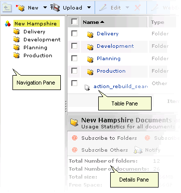 Der Projekt-Explorer, Projekt-Papierkorb und die Registerkarten "Aufgaben", "Dokumente", "Diskussionen", "Wiki" und "Blog" in der Oracle WebCenter Collaboration-Anwendungsansicht sind in drei Fensterbereiche unterteilt: den Navigationsbereich links, den Tabellenbereich rechts und den Detailbereich unten rechts. Der Tabellenbereich enthält Objekte, die zu dem Knoten gehören, den Sie im Navigationsbereich ausgewählt haben.
